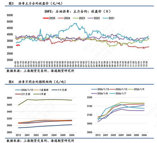 【1】盘面表现:BU 2603主力合约日内高开后维持震荡,最终收盘价3140,较昨日结算价-0.66%,盘中最高触及3153,最低3093。按收盘价算近7天累计+3.9%。次月合约2606较昨日结算价-0.25%。近月跌幅高于远月合约。